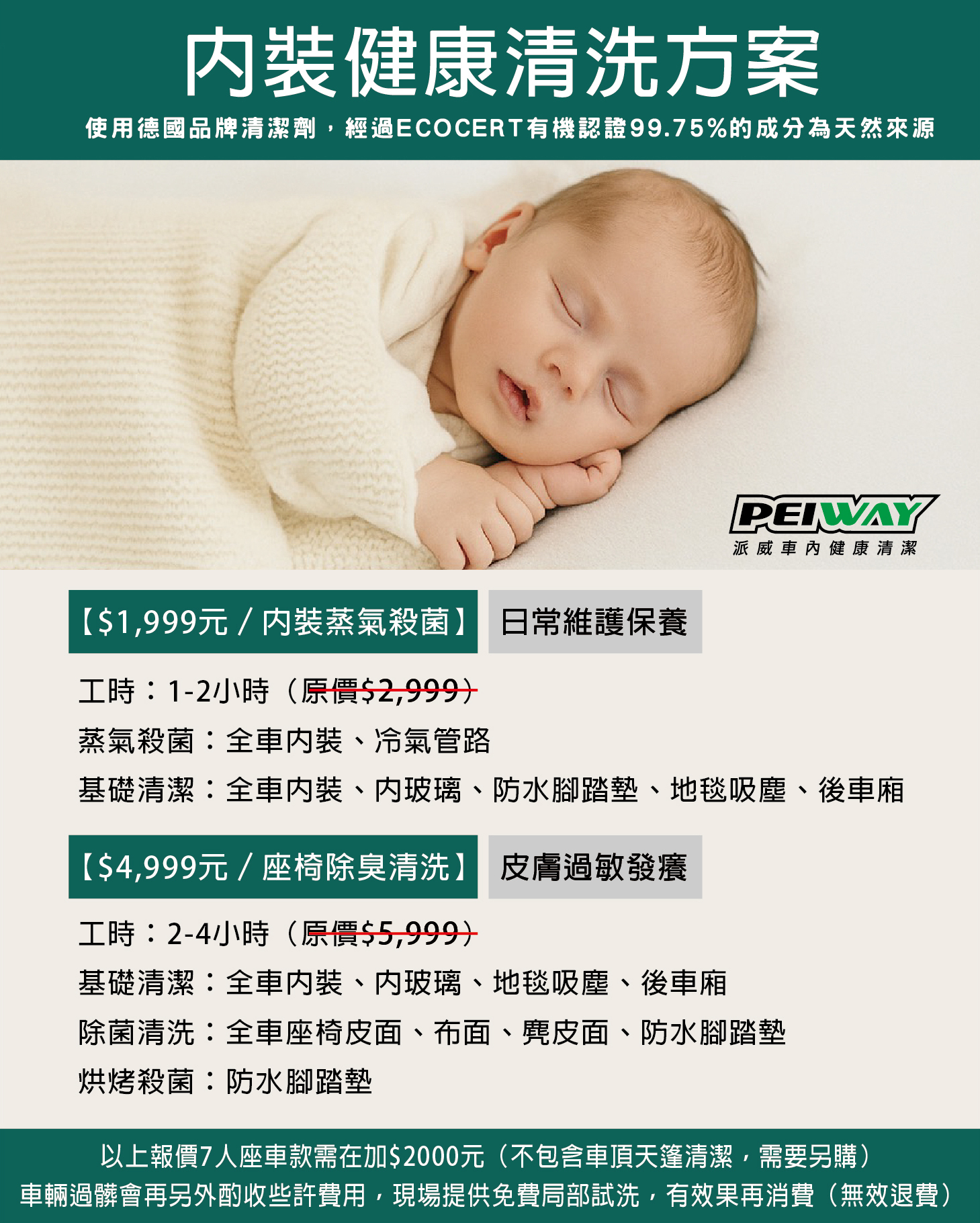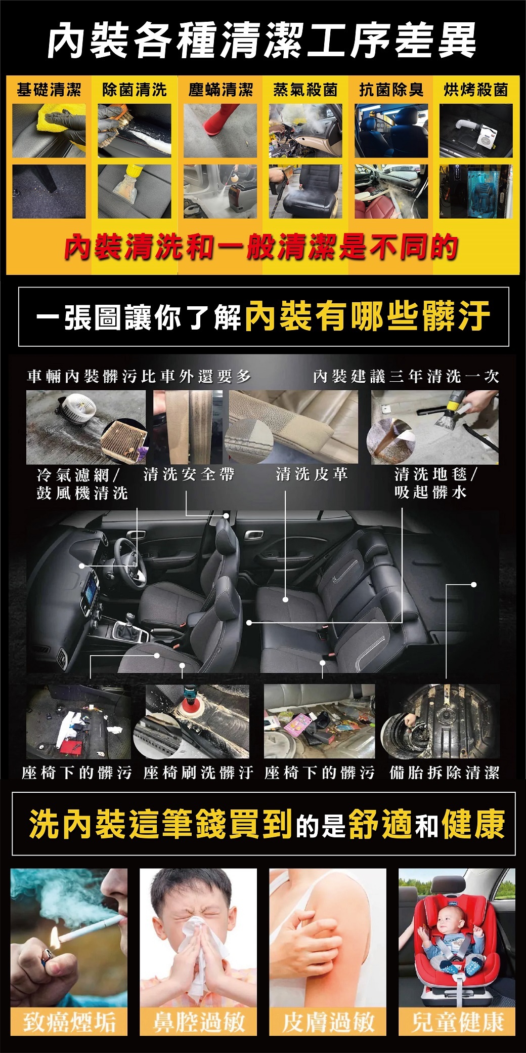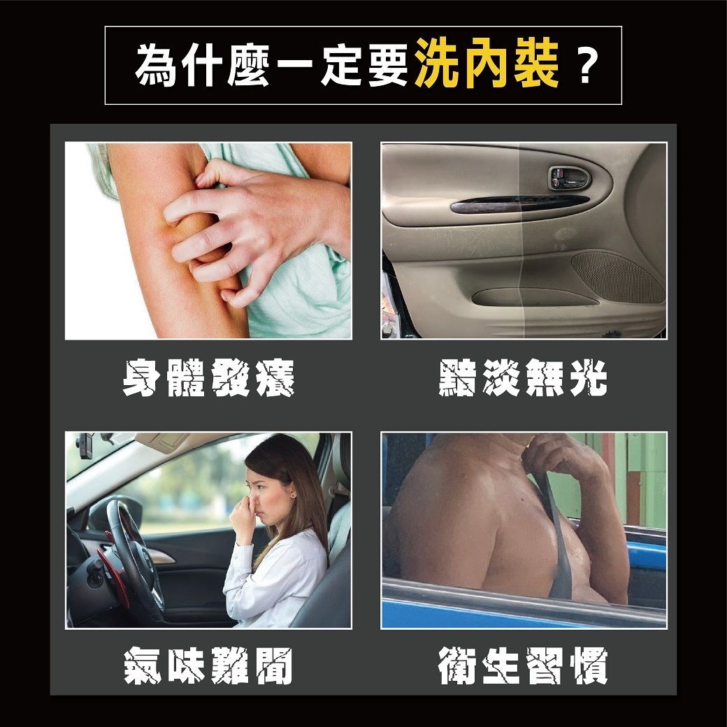 舊車因內裝長期使用會沾黏各種汗漬髒污,建議內裝每三年固定清洗一次維持好車內衛生品質